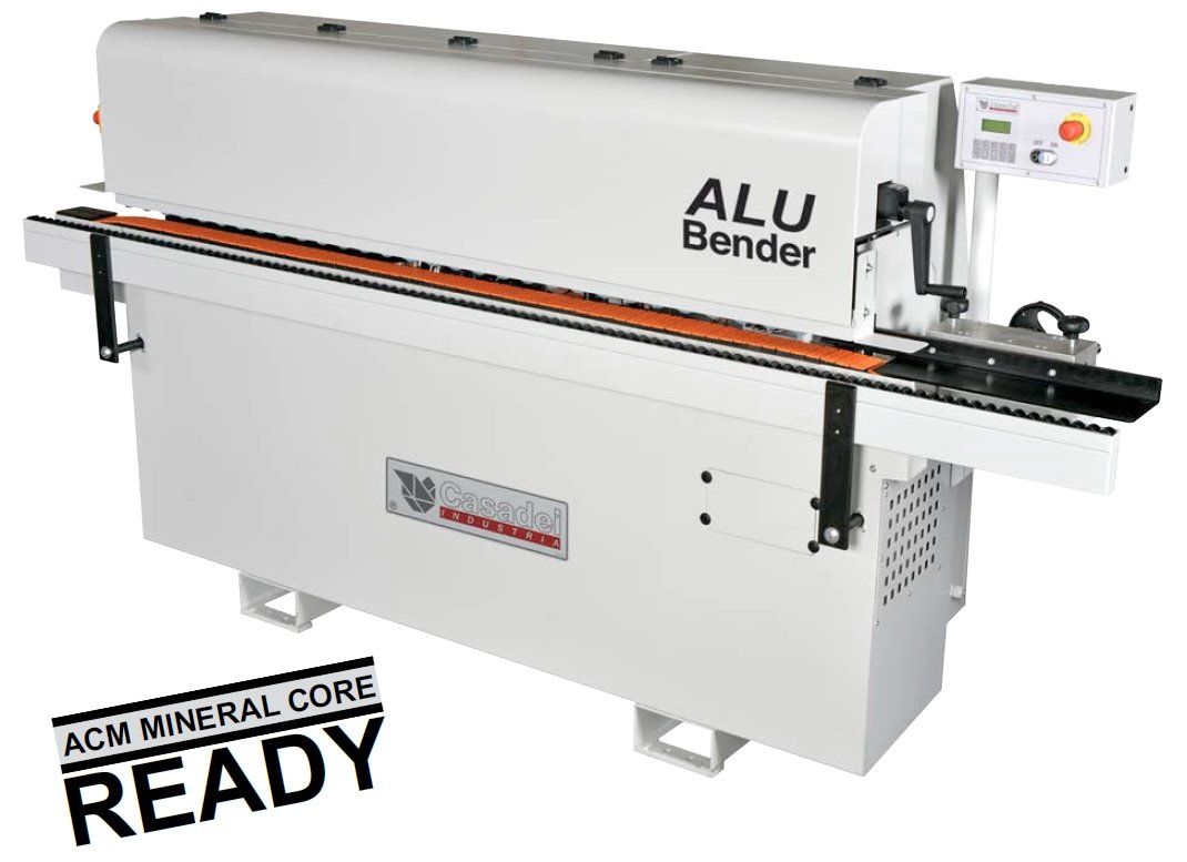 Automatische Fräs- und Biegemaschine zur Bearbeitung gerader Kanten an Verbundplatten für Gebäudefassaden, Transportindustrie, Innenausbau und Werbemittelindustrie.