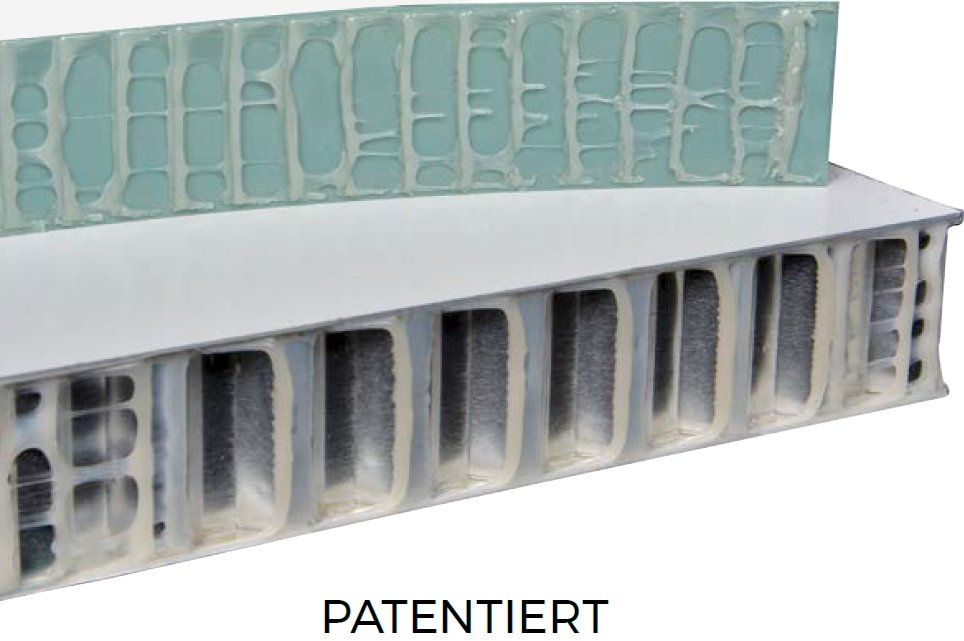 Das wirkungsvolle Bearbeiten von Alu- Wabenplatten, durch ein spezielles Bördel und/oder ein Klebeverfahren mit Polyurethan-Klebstoff , wird der Kern komplett verdeckt / geschlossen.
